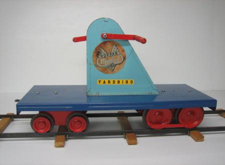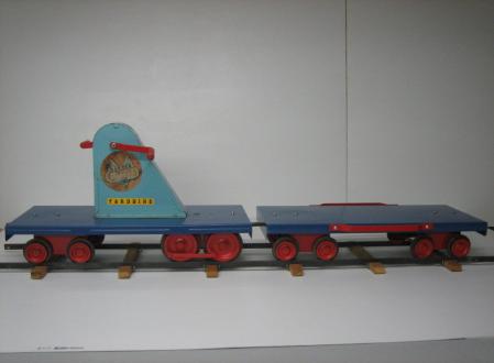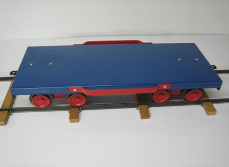 | The Flat Car (formerly called the Trailing Car) was also shortened to 27.75". The number of side hand-holds was reduced to two. All of these changes were obviously designed to reduce the toy's weight - and make cranking easier! A wooden framework was available to convert the flat car into a gondola. |