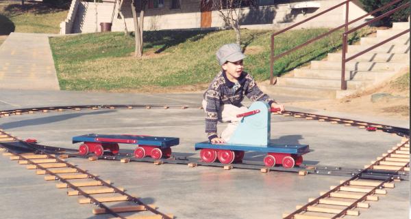 | James had to be reminded that this is not the proper way to operate the hand-car. The driver is to sit on the end with the large wheels, legs extending on both sides of the tower, and crank like mad. James preferred the diesel. The small wheels on the front of the hand-car and on the flatcar use lower axle holes drilled in the side of the trucks. The large wheels have higher axle holes. |