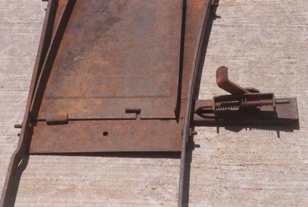 | In addition to the basic curved and straight track sections, you'll also need four of the special off-set sections shown above. These connect the turn-outs with the rest of the track sections. An un-restored turn-out is shown at right and below. The basic construction includes a small movable pan inside the larger base pan. You'll notice the simple spring loaded flip lever that controls the direction of the track. It is designed so that even if someone forgets to flip the switch the engines can still force their way through the turn-out without any harm being done. |