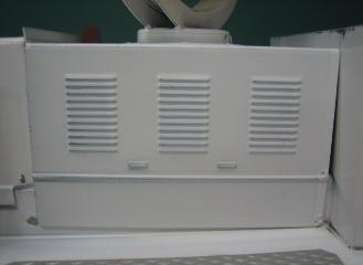| The louvered cover slides up to reveal the battery compartment. |