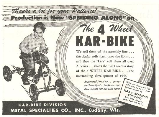 | Advertising and other literature regarding Kar-Bikes is very scarce. The ads shown on this page and page 2 were published when Metal Specialties, Inc., of Cudahy, Wisconsin was listed as the manufacturer. Ads on the next page were published when the Weller Products Company produced the Kar-Bike. You'll notice that their ads proclaim them as the "originators and designers" of the Kar-Bike. This is hard to explain. Perhaps the original design was by Weller and they contracted with Metal Specialties to produce the first versions, later assuming production themselves. That's just a guess. Unless noted otherwise, all ads were originally full-page (8.5" x 11") when published. |