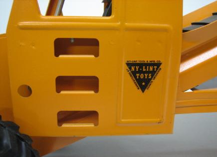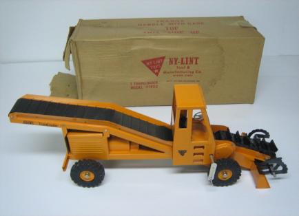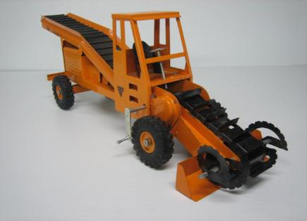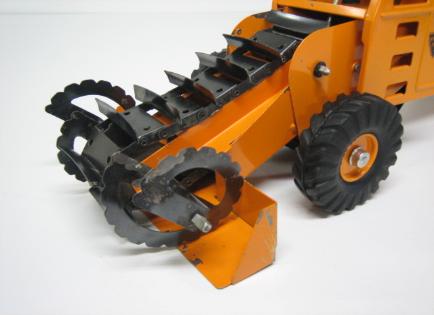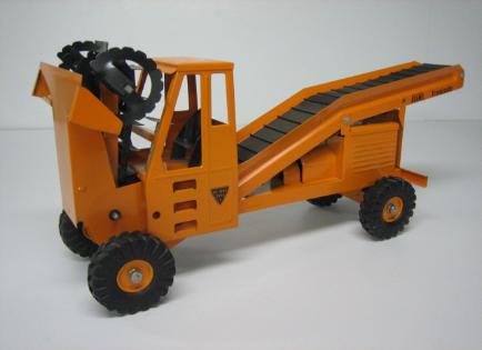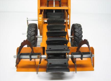 The first version featured wide blades for loading gravel, etc., onto the conveyor belt. This may have