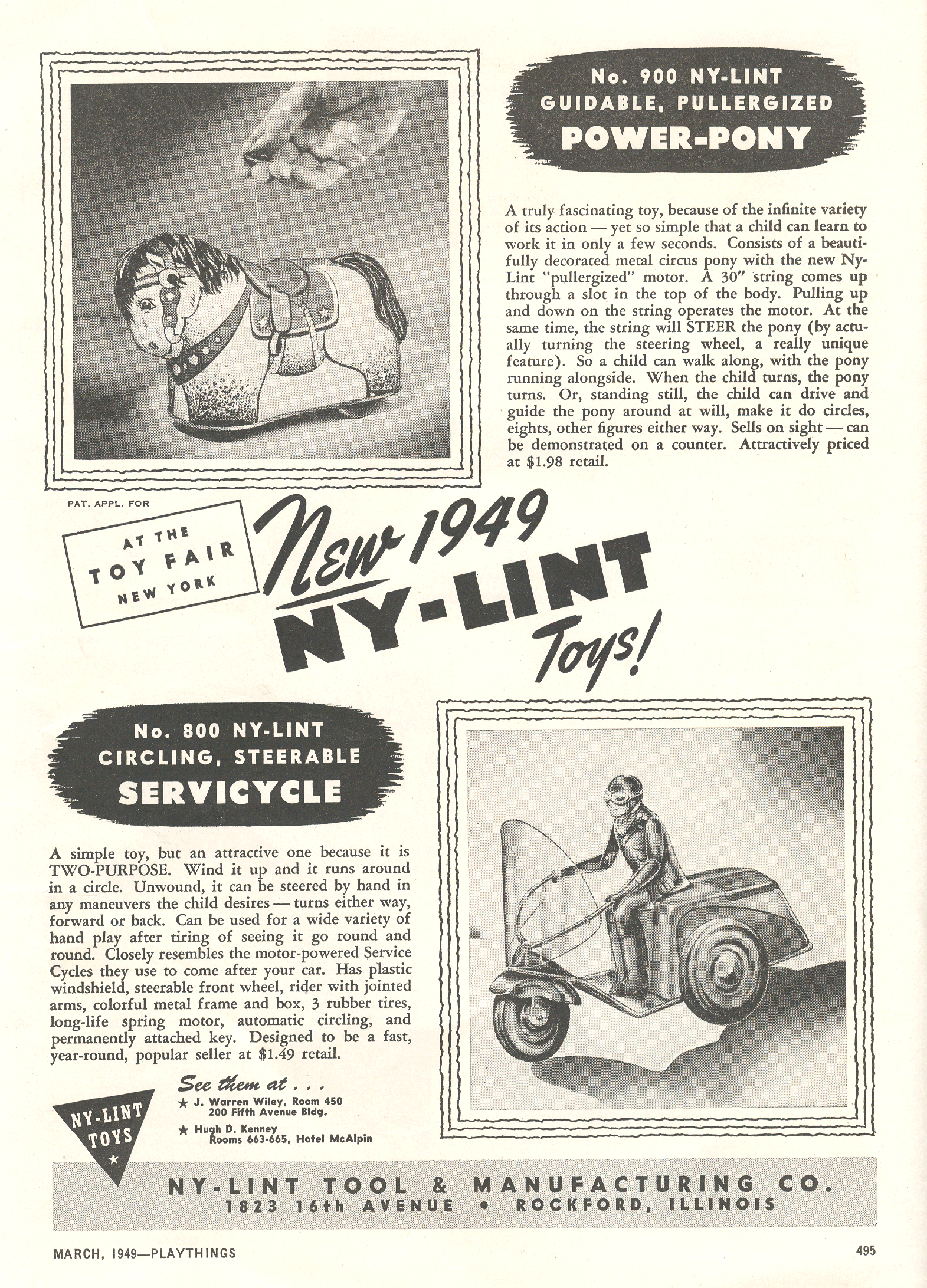 | A "pullergized" motor? This 1949 ad may have been Nylint's biggest adventure in wishful thinking. As far as is known not one of these No. 900 Power-Pony toys exists today. Was it too complicated? Too fragile? Unworkable? No one seems to know if it was ever produced. If it was, there must be an awfully few of them out there. The No. 800 Servicycle, however, was produced in quantity and seemed a popular toy, although they too are scarce today. |