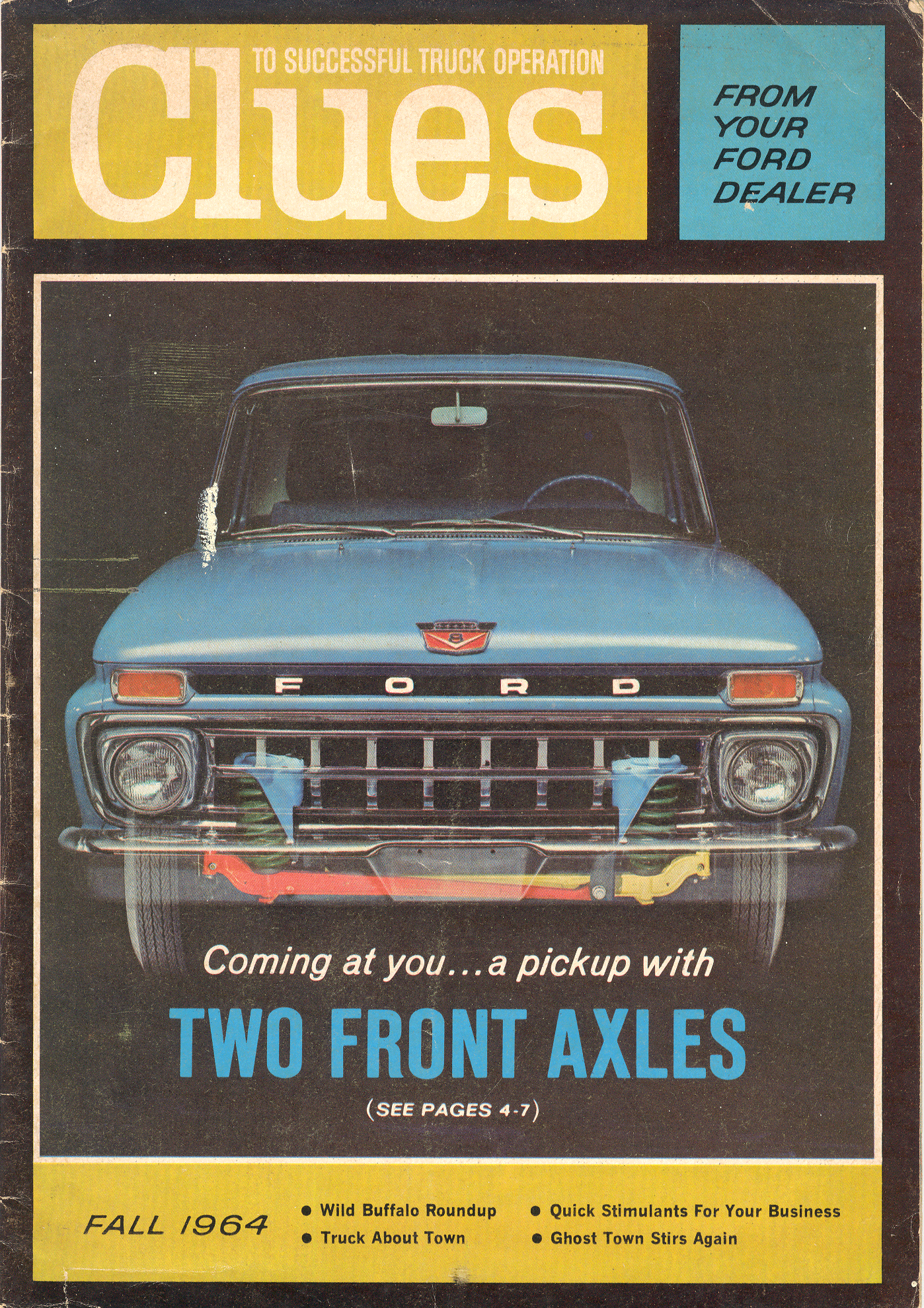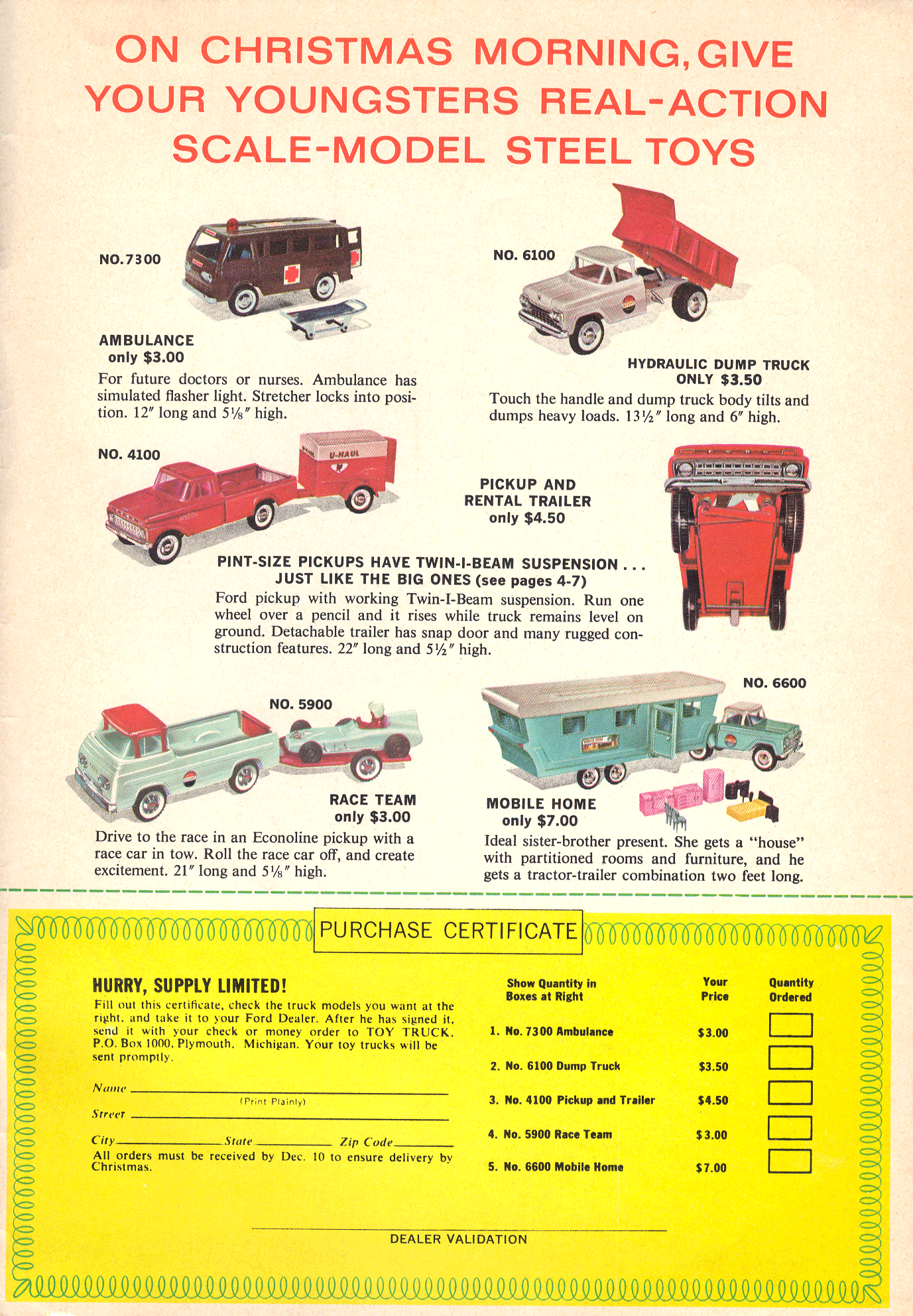 | Clues magazine was published quarterly by the Ford Motor Co. to be used in dealer showrooms to provide customers with "helpful information to all truck owners, whether they drive Fords or trucks of any other make." And if you believe that... The Fall issue of 1964 included the full-page ad below encouraging you to "HURRY" and get your youngster a real-action scale-model steel toy in time for Christmas. Note orange-roofed U-Haul pick-up - I've never seen one. Note also the "sister-brother" appeal regarding the No. 6600 Mobile Home. |