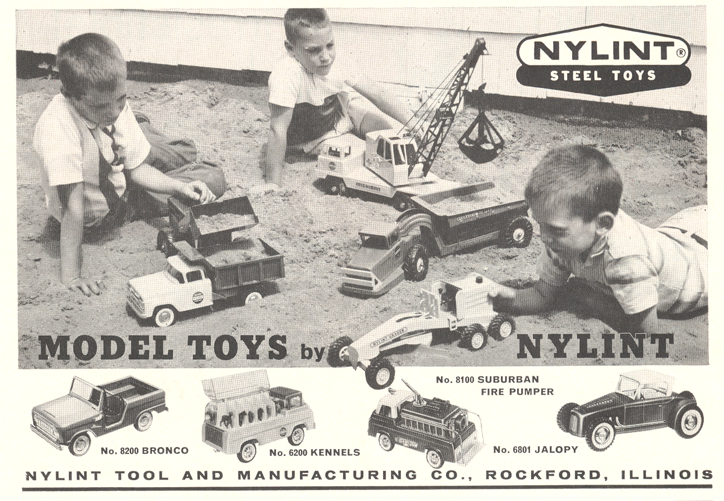 | This classic ad is dated November, 1965 and comes from Playthings magazine. Note the return of a road grader to the Nylint line-up. The demise of the No. 3000 Grader-Loader after 1962 left a two year void in this construction department. |