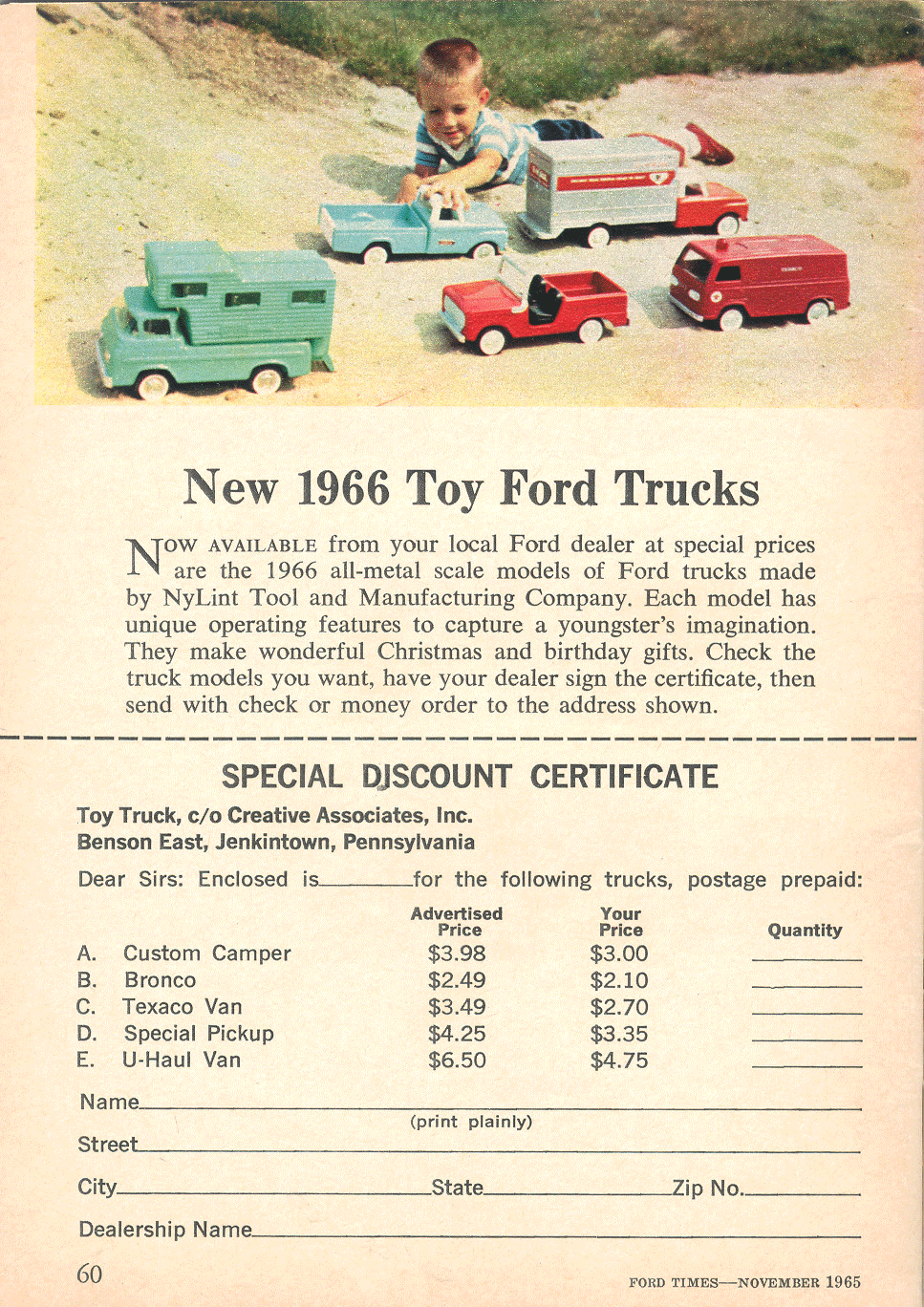 | In the Fall of 1965 it was customary for all automobile dealers to advertise the new cars and trucks for 1966. The same principle was applied in November, 1965 when the Ford Times magazine began advertising the 1966 line-up of Nylint toy trucks available from your friendly local Ford Dealer. The blue and white Nylint pick-up is shown without the usual Philco radio camper - and with a tailgate! It was indeed offered in this configuration (as No. 8500) but few originals are found today. |