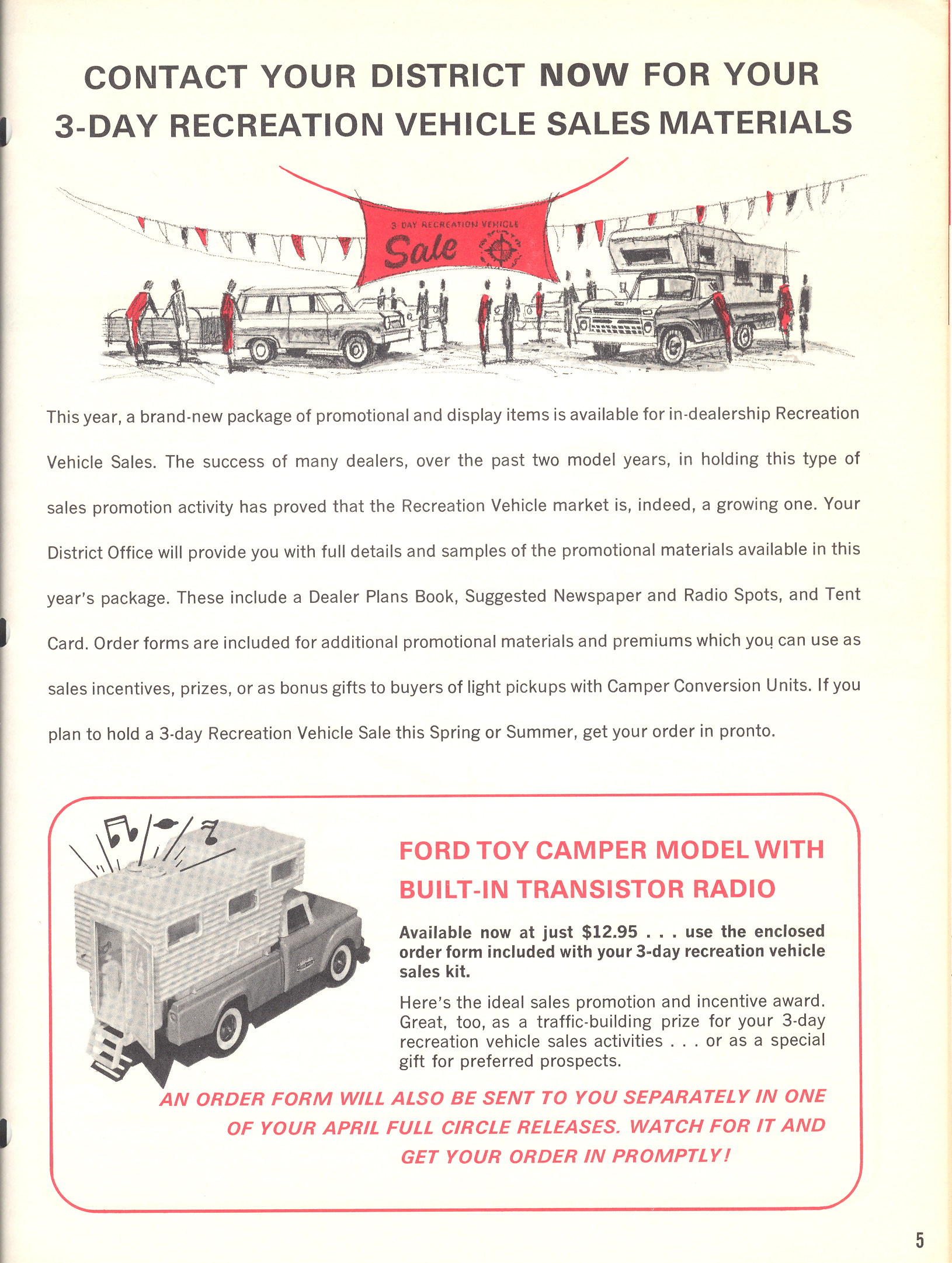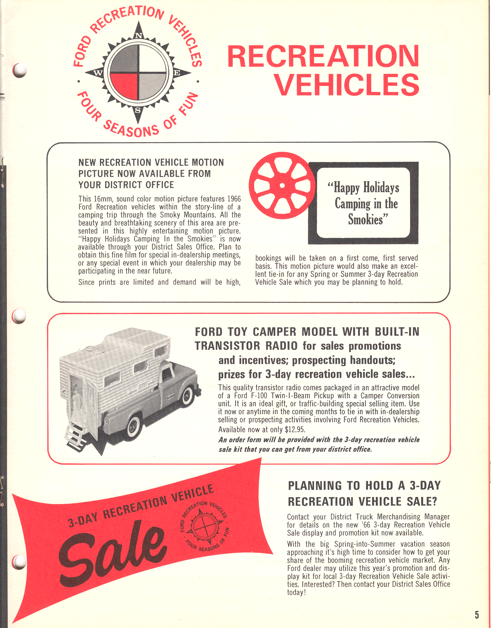 | Ford continued their close relationship with Nylint in 1966. Their spring-time "Action Guides," distributed to dealerships around the country, featured ads for the Nylint F-100 series campers. |