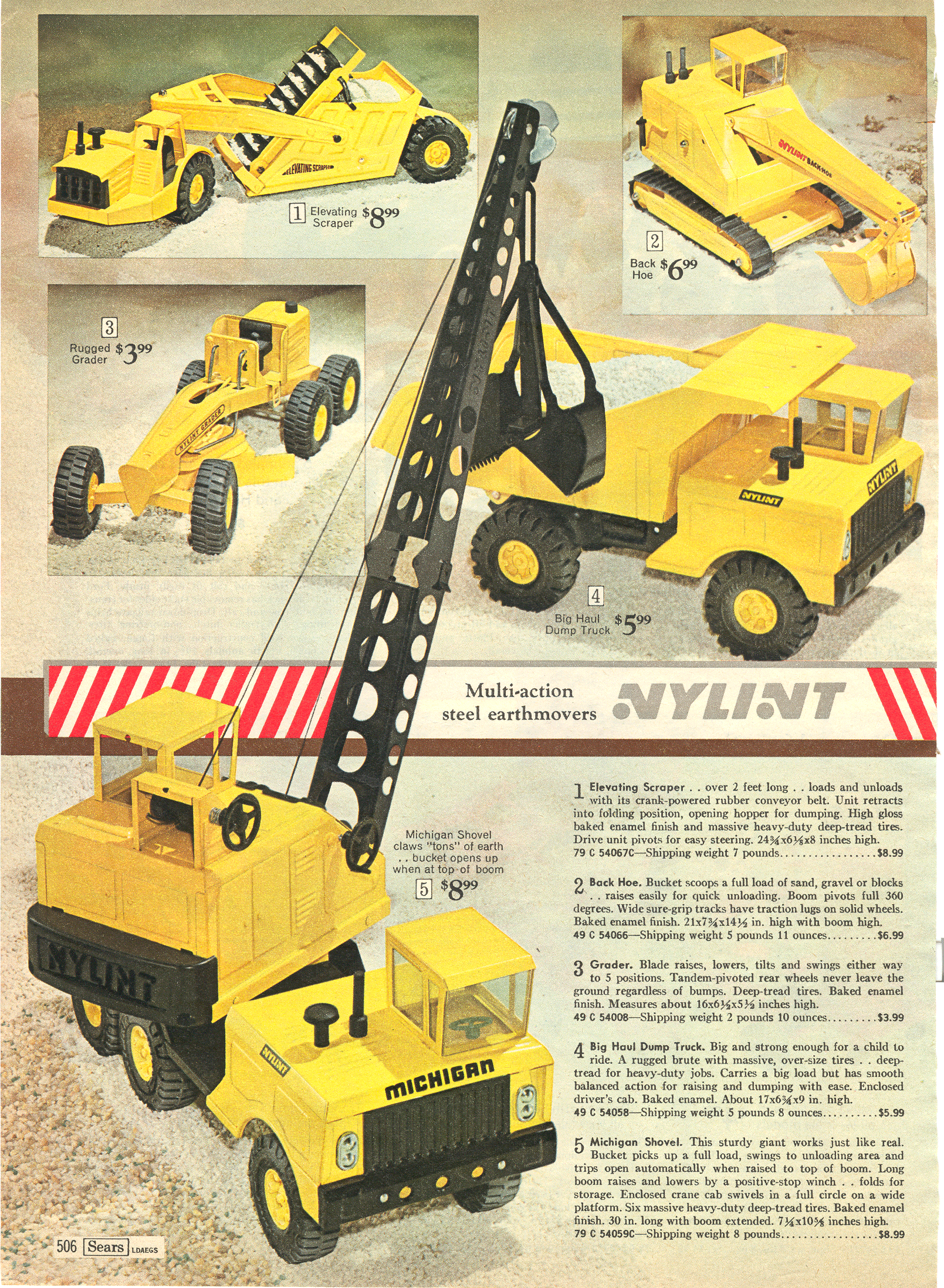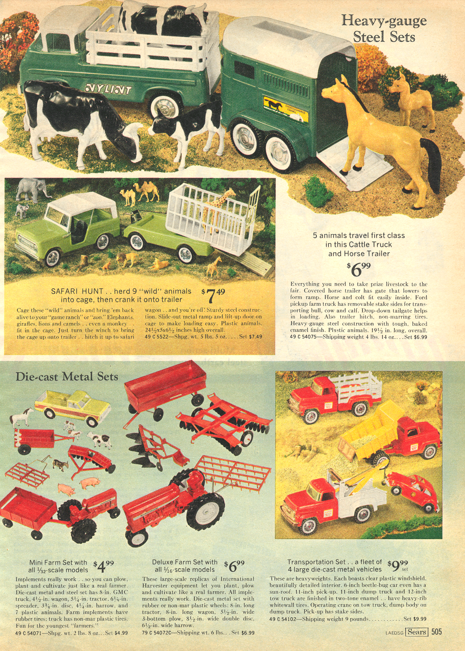 | This 1969 double-sided ad from the "Sears Toy Book" features a toy not found in the 1969 Nylint full-line manufacturer's catalog. The dark green "Cattle Truck and Horse Trailer" may have been produced exclusively for Sears. |