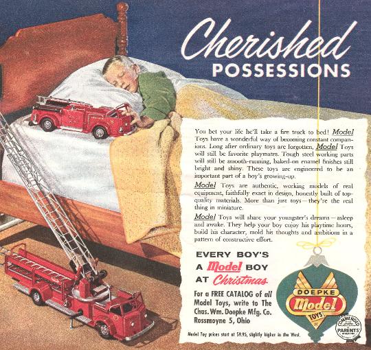 | What little guy hasn't dreamed of becoming a real "Fire Man?" This ad from the December, 1954 issue of American Magazine emphasizes the realistic nature of the Doepke Fire Toys - and rightly so! They were spectacular 1:16 scale replicas of the real thing. |