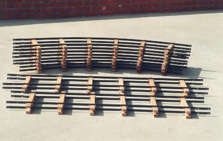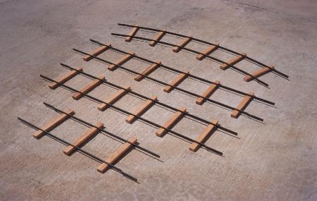 | What's a train without a track? Doepke had a huge variety of track pieces available for anyone who wanted to expand from the simple 13' diameter circle that came with the first Yardbird. Shown here is Doepke's deluxe set-up featuring a figure-eight design with a 90-degree crossing. I restored the crossing and the four turnouts, but had to make all the track sections by hand. All track came knocked down and had to be assembled by the purchaser - a tedious job that was well beyond a child's ability. But, as each piece goes together, the excitement and anticipation mount. When finished, you had a real railroad - right in your own backyard! |
