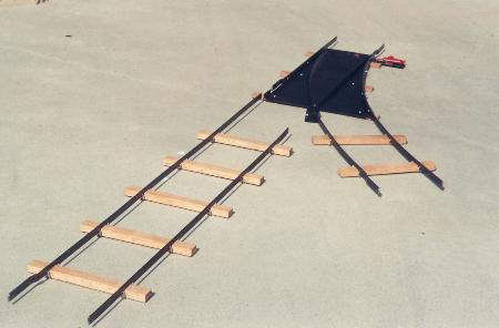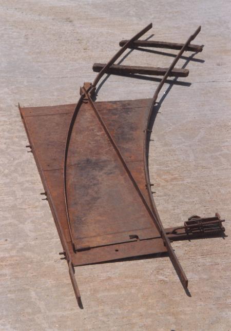 | In addition to the basic curved and straight track sections, you'll also need four of the special off-set sections shown above. These connect the turn-outs with the rest of the track sections. An un-restored turn-out is shown at right and below. The basic construction includes a small movable pan inside the larger base pan. You'll notice the simple spring loaded flip lever that controls the direction of the track. It is designed so that even if someone forgets to flip the switch the engines can still force their way through the turn-out without any harm being done. |