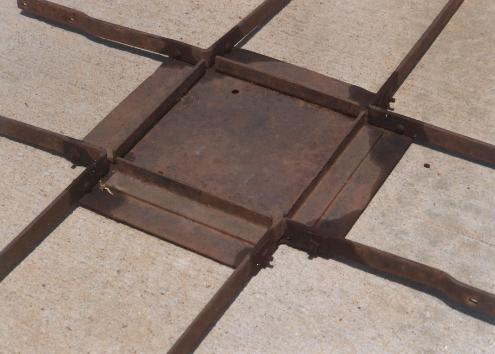 | At right is the 90-degree crossing necessary for creating the figure-eight lay-out. It is a simple pan with four welded flanges and turned up corners for bolting on the right-angle lengths of track. The legs of the crossing are not symmetrical - due to the odd lengths of straight track that intersect with it. This is the only original crossing I've ever seen. It was used as a pattern for the manufacturing of a few reproduction crossings. |