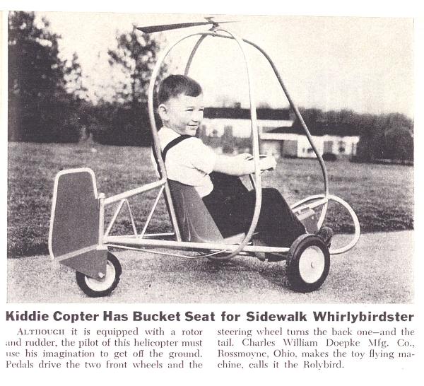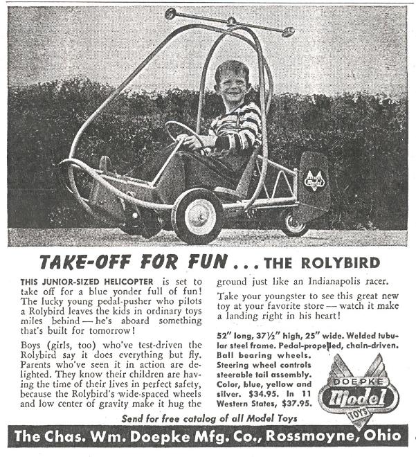 There's a good chance that this young fellow is piloting an early prototype of the Rolybird. It has no decals on the rudder, nor does it have the correct blade. Also, the light colored outline on the rudder did not appear in later ads. He doesn't seem to care about those details as he counts himself very lucky to be one of the first to drive such a modern and exciting new pedal toy. This item appeared in Popular Science magazine in June of 1955. |