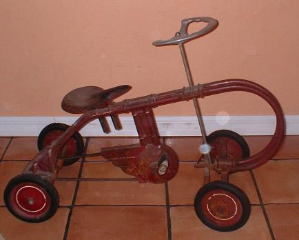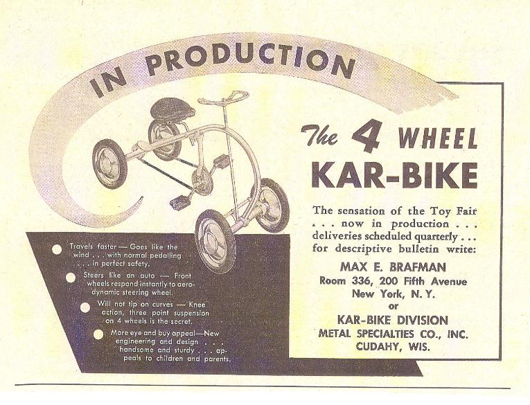| "Goes like the wind." -- Although undated, this ad showing a single-tube Version #2 example is very interesting in that the paint color appears to be of a lighter shade than the ever-present maroon found on most Kar-Bikes. Could this be evidence that pea-soup green was actually an original Kar-Bike color? |