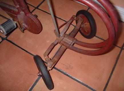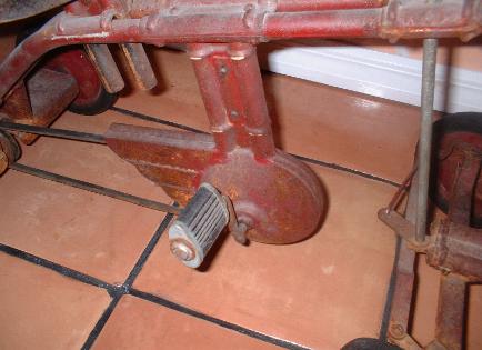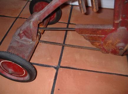 | Interesting details showing shaped housings for front and rear v-belt pulleys and unique side-by-side tube construction of the frame. No markings on pedals. No evidence of hub-caps ever being present. |