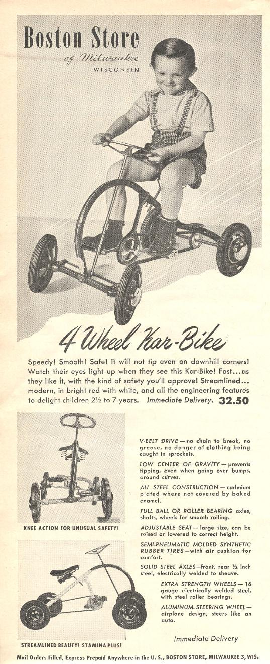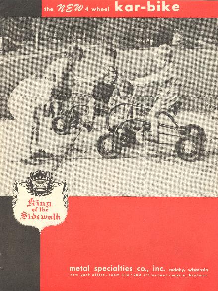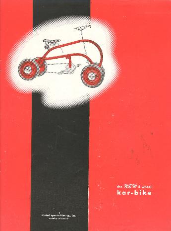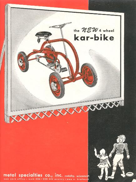 | Advertising and other literature regarding Kar-Bikes is very scarce. The ads shown on this page and page 2 were published when Metal Specialties, Inc., of Cudahy, Wisconsin was listed as the manufacturer. Ads on the next page were published when the Weller Products Company produced the Kar-Bike. You'll notice that their ads proclaim them as the "originators and designers" of the Kar-Bike. This is hard to explain. Perhaps the original design was by Weller and they contracted with Metal Specialties to produce the first versions, later assuming production themselves. That's just a guess. Unless noted otherwise, all ads were originally full-page (8.5" x 11") when published. |