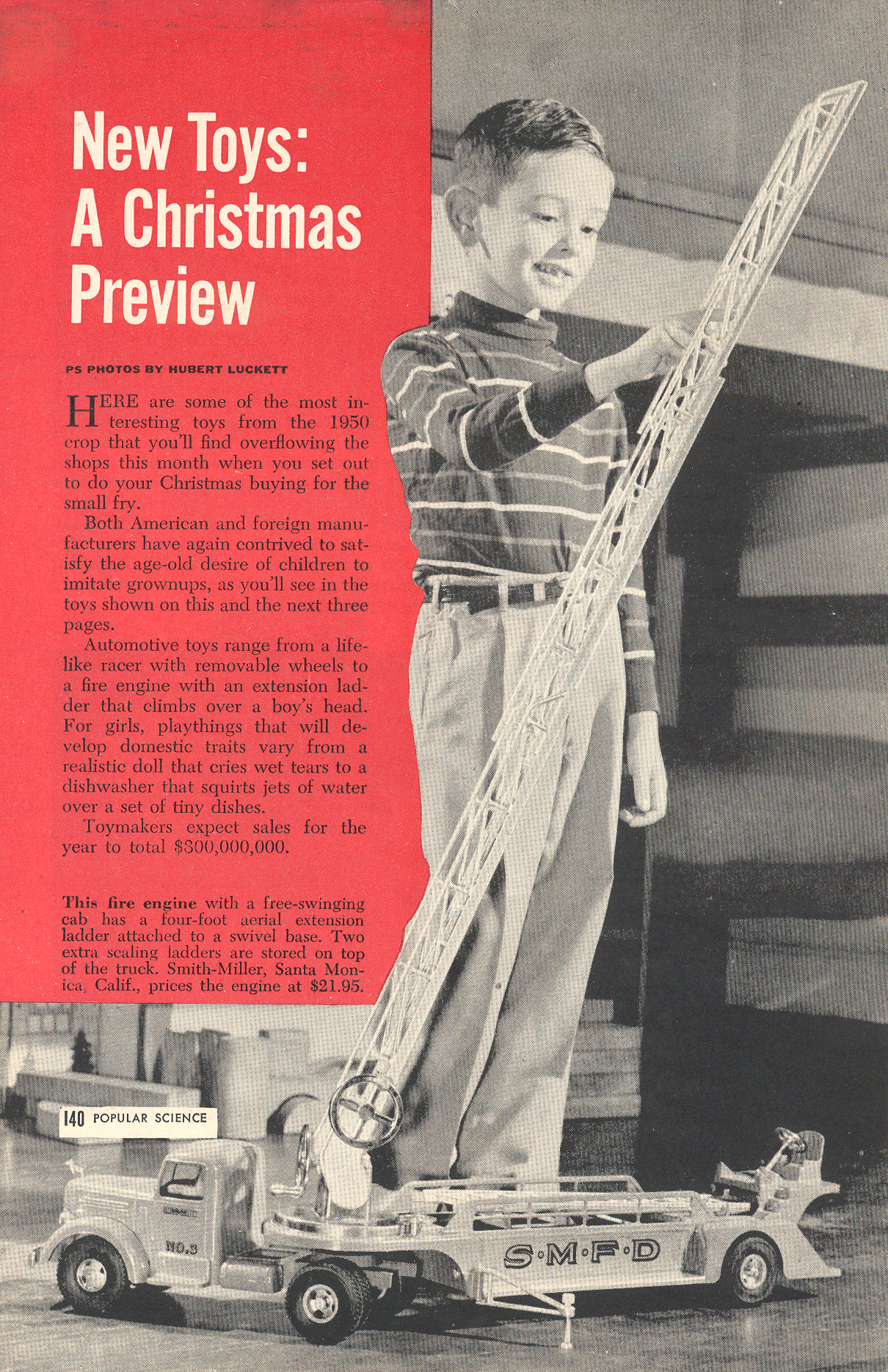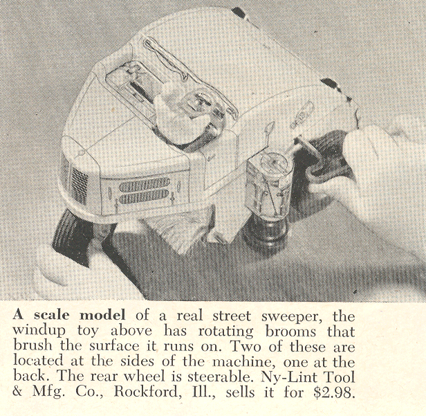 the cover, another one of Nylint's ingenious mechanical toys was included among the Popular Science toy previews for Christmas, 1950. The No. 1100 Streetsweeper, while not as complex as the Mechanical Lift Truck, apparently still merited mention as one of the nation's "most interesting" toys of the time. |