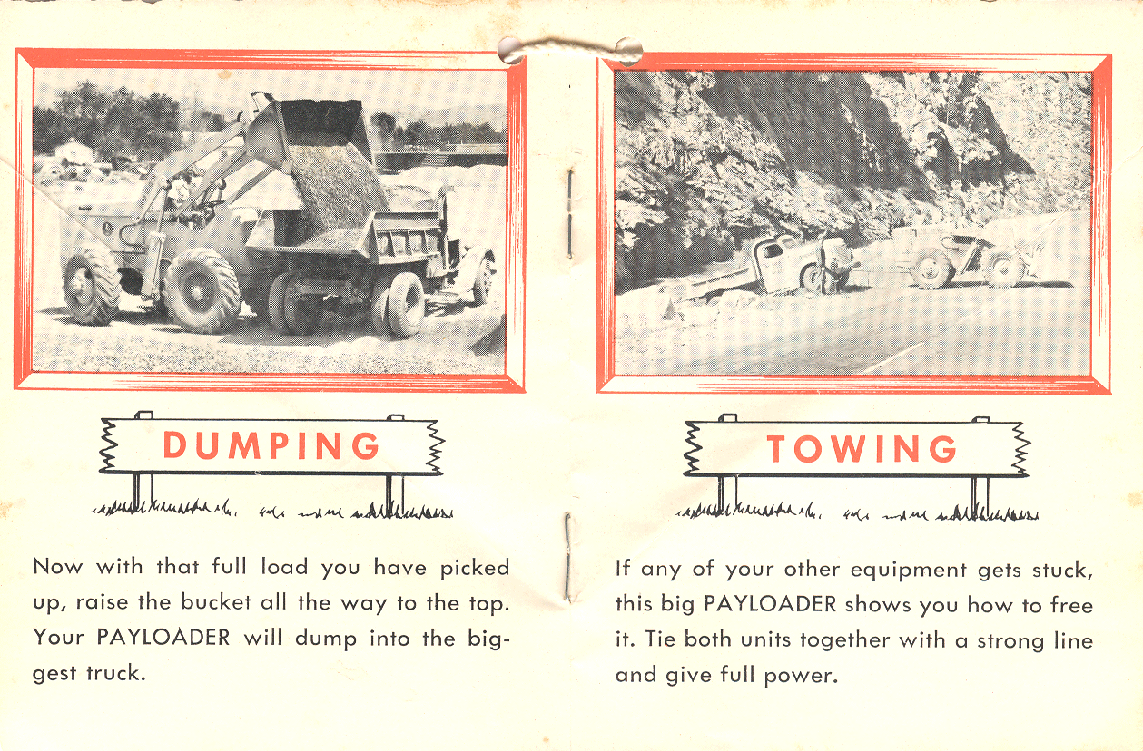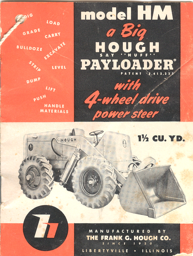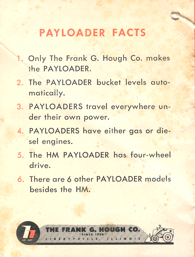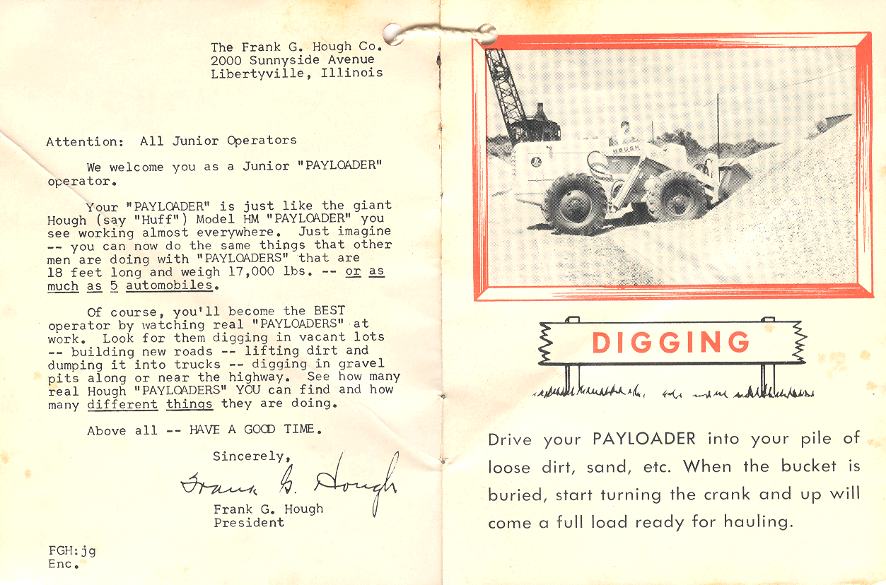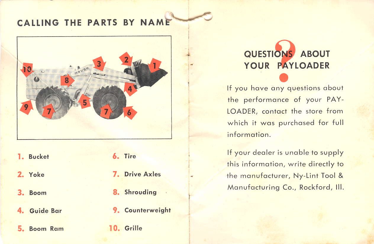 | The publishing of a small informational booklet to accompany the No. 1600 Hough Payloader was a great Nylint idea. It's cover mimicked the booklet used by the Hough Co. to market its real machine. It is not know what versions of the Payloader this booklet came with. The best guess is that it may have been only the first few. |