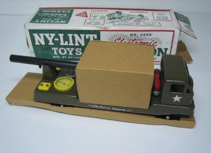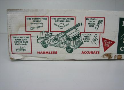 A most popular toy. Easy to find today, but not always with the original box and red rockets. The box