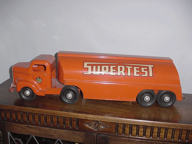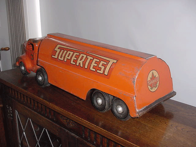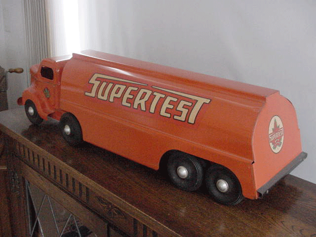 | Ron has two different versions of the Supertest Tanker Truck. The first one (which is in superb condition) has a decal on the roof identifying the retailer who sold the truck originally. See below. |
