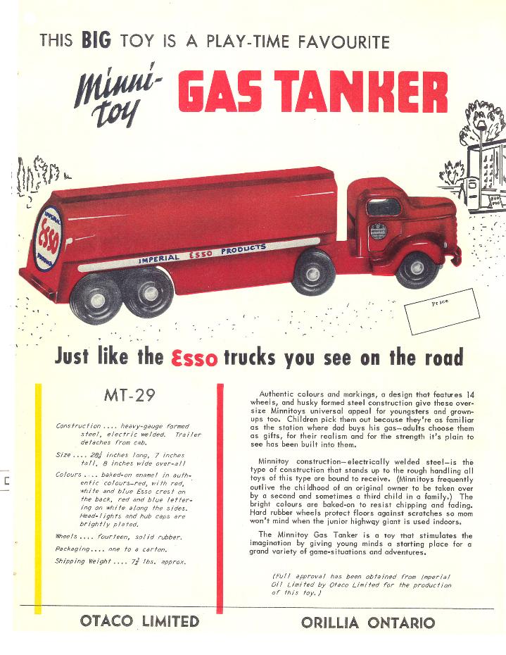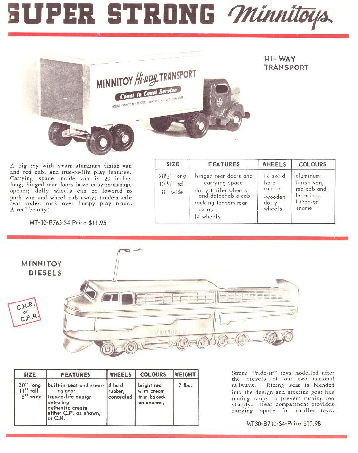 | The catalog pages shown below are undated. My guess would be 1956 or later. Only one semi-trailer is shown which may indicate that the Hi-way Transport was the first original version of this style of truck. |