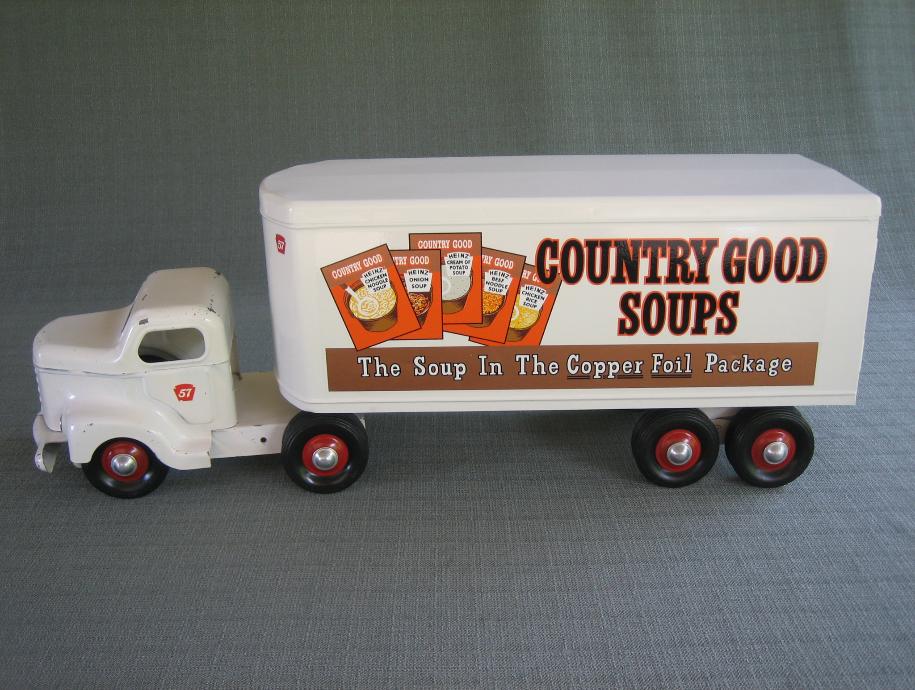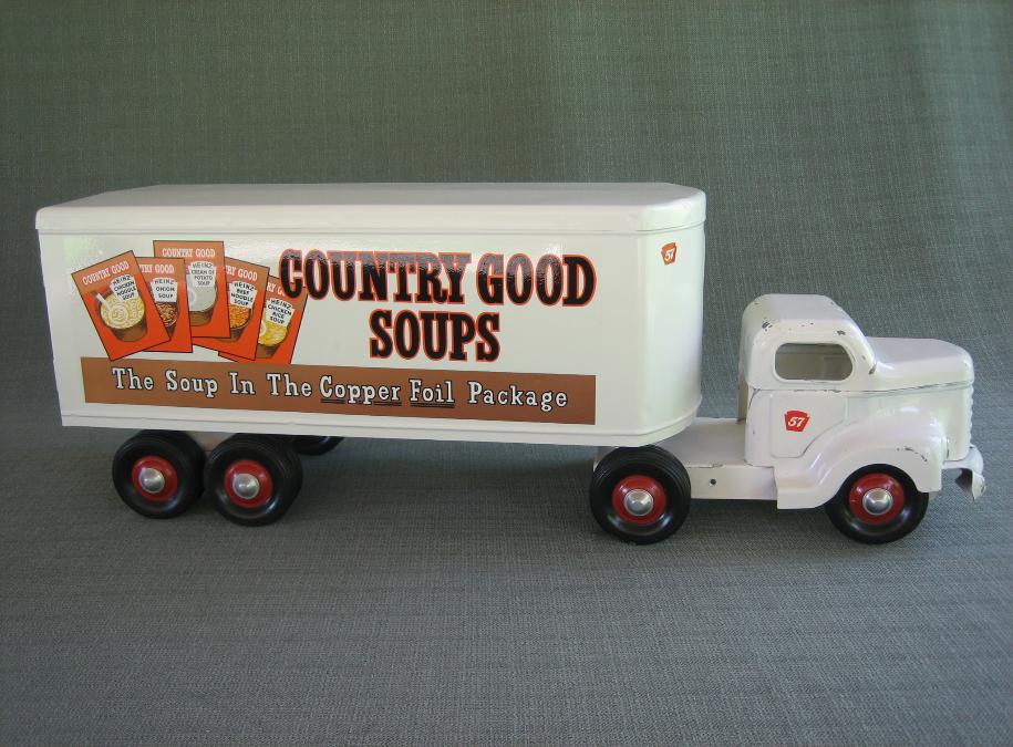 extremely poor condition, yet the tractor was in relatively nice shape. The trailer was powder- coated "Yolk White" and new decals applied. Restoration is generally not advised - especially if the truck is a rare version. In this case, however, it was the best option. |