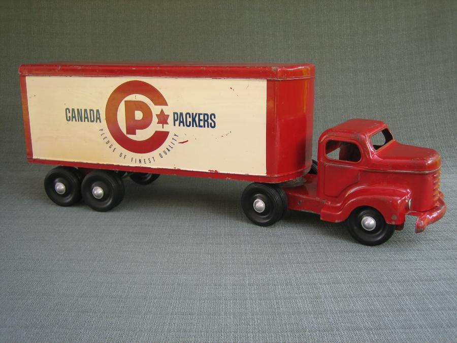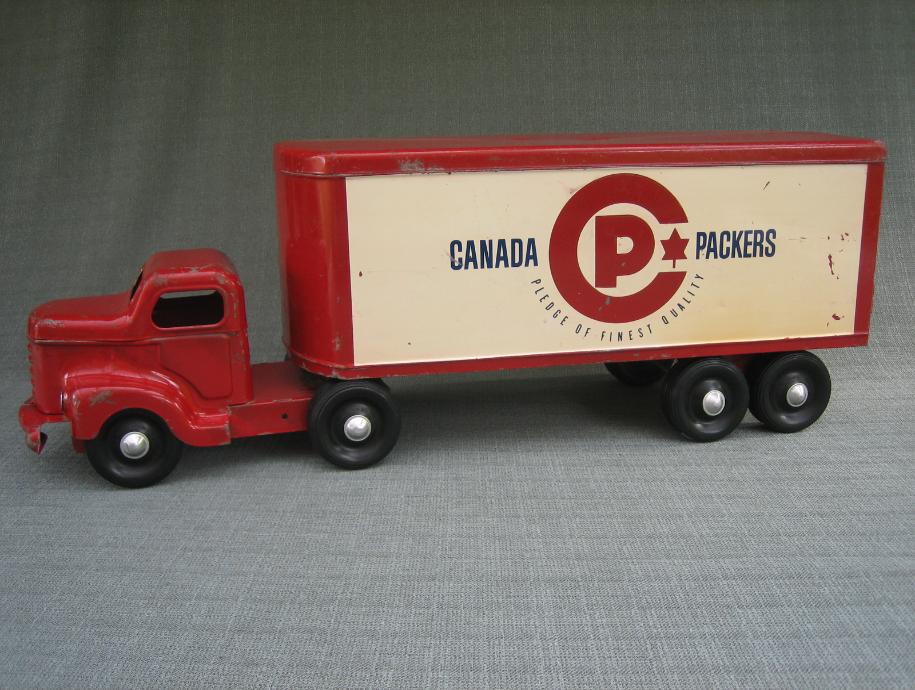 This Canada Packers truck has seen its share of use, but, aside from the chipped paint, has held up rather well over the years. English is used on both sides. It is not known if there was a French version of this truck.