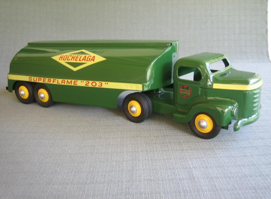 | This is a RESTORED truck. I bought it in this condition since the restoration work was beautifully done and since I haven't been able to find a nice unrestored original. The Hochelaga green/ yellow/red color scheme has always been a favorite of mine - especially with those yellow wheel covers! |